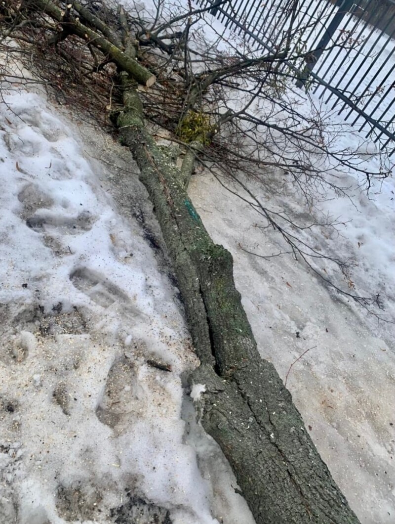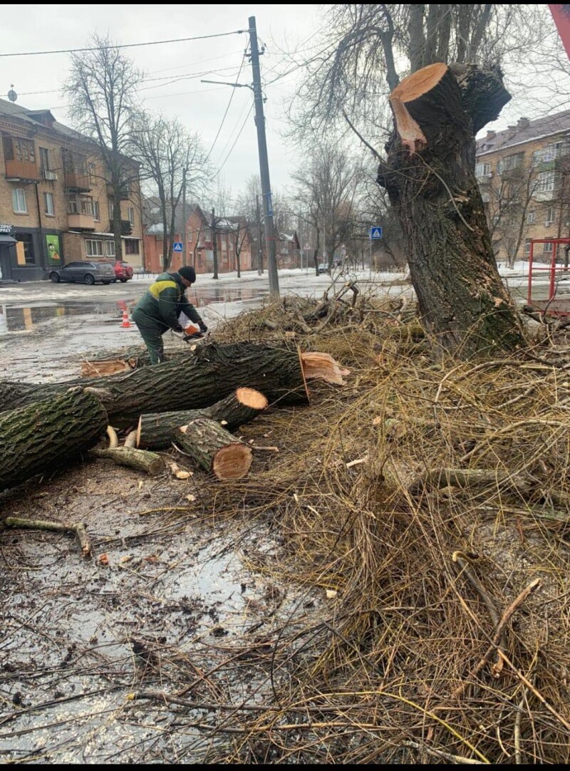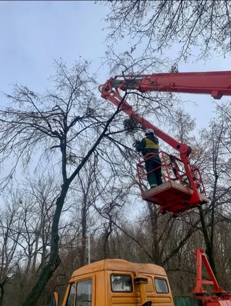 Фотофіксація проведення робіт з видалення омели, обрізки, знесення сухостійних дерев на вулиці Новопольовій відповідно до Акту № 128-А обстеження зелених насаджень, що підлягають видаленню від 19.02.2025.