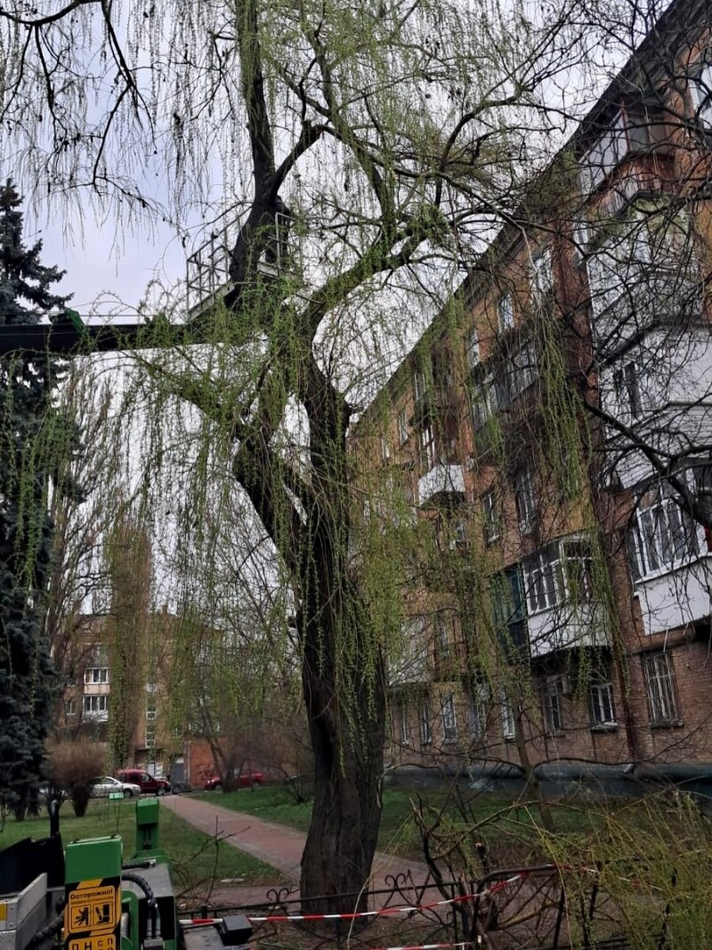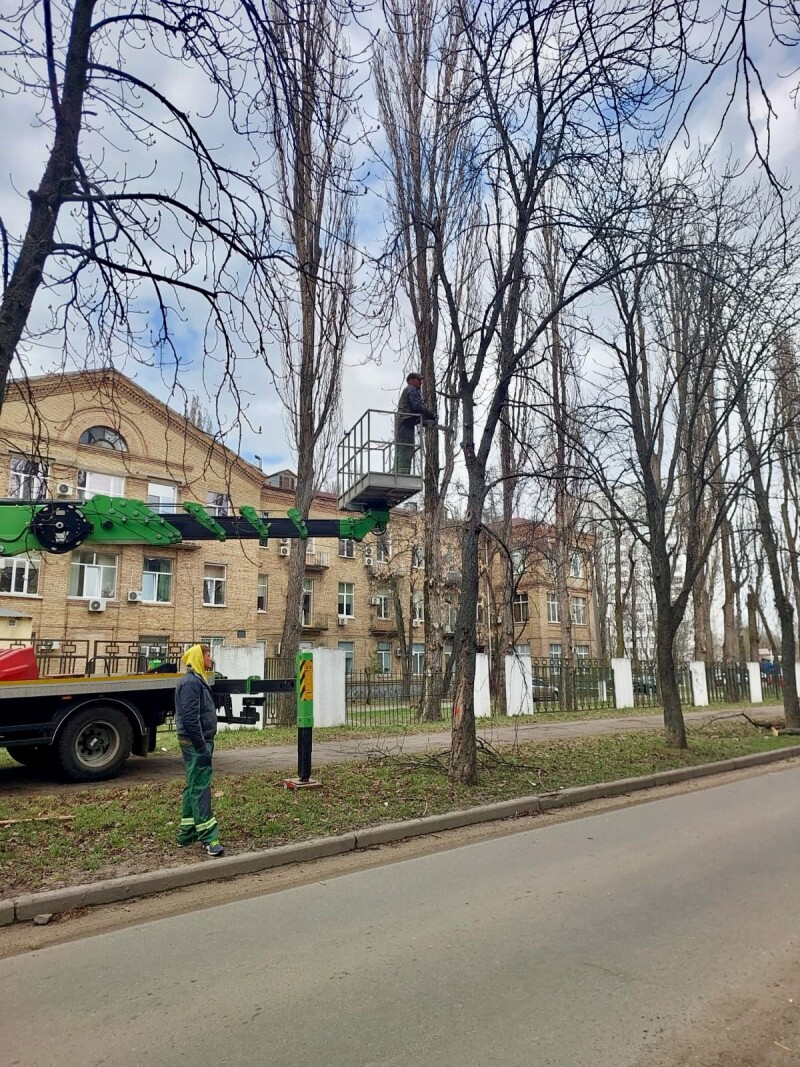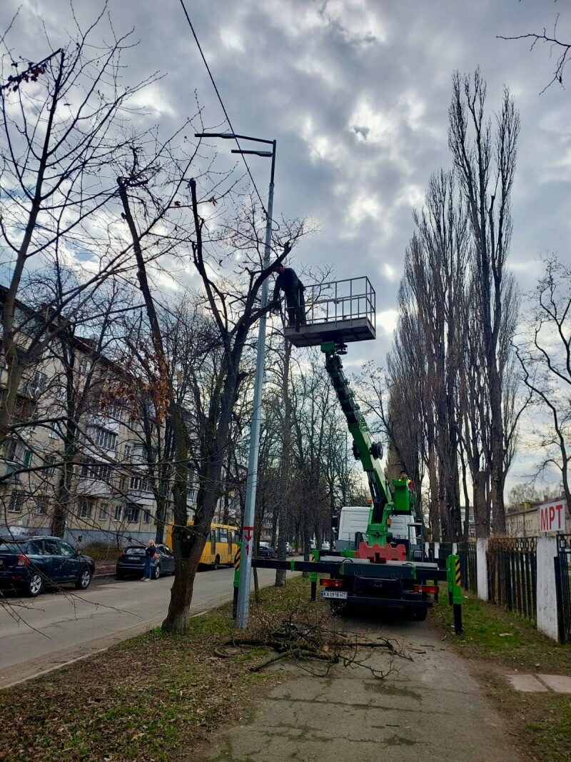 Фотофіксація проведення робіт з санітарної обрізки гілля в сквері на проспекті Повітряних Сил, 43 та знесення аварійних дерев на вулиці Стражеска згідно акту № 1377-А від 11.12.2025 обстеження зелених насаджень, що підлягають видаленню.